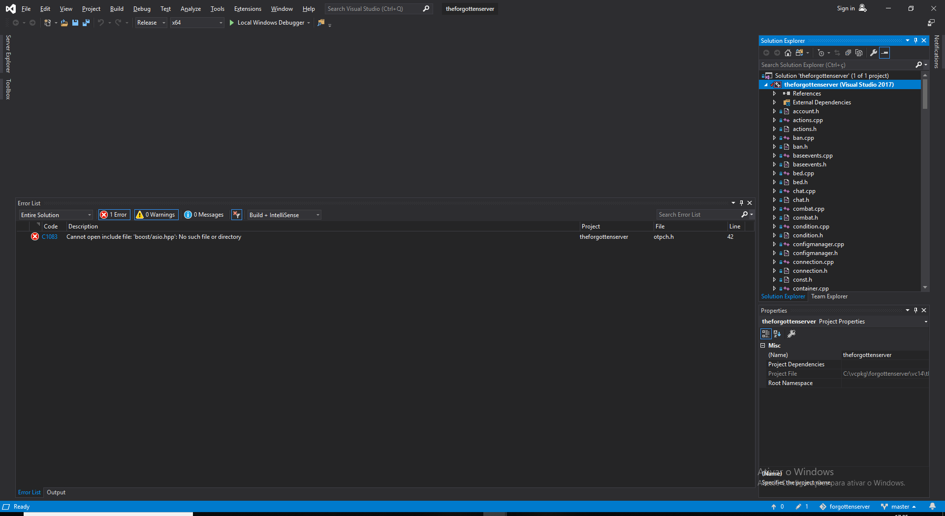 Alguém que já compilou este servidor poderia me dizer o que estou fazendo de errado ou diferente do tutorial? (além do visual studio que não é o 2017 hehe)