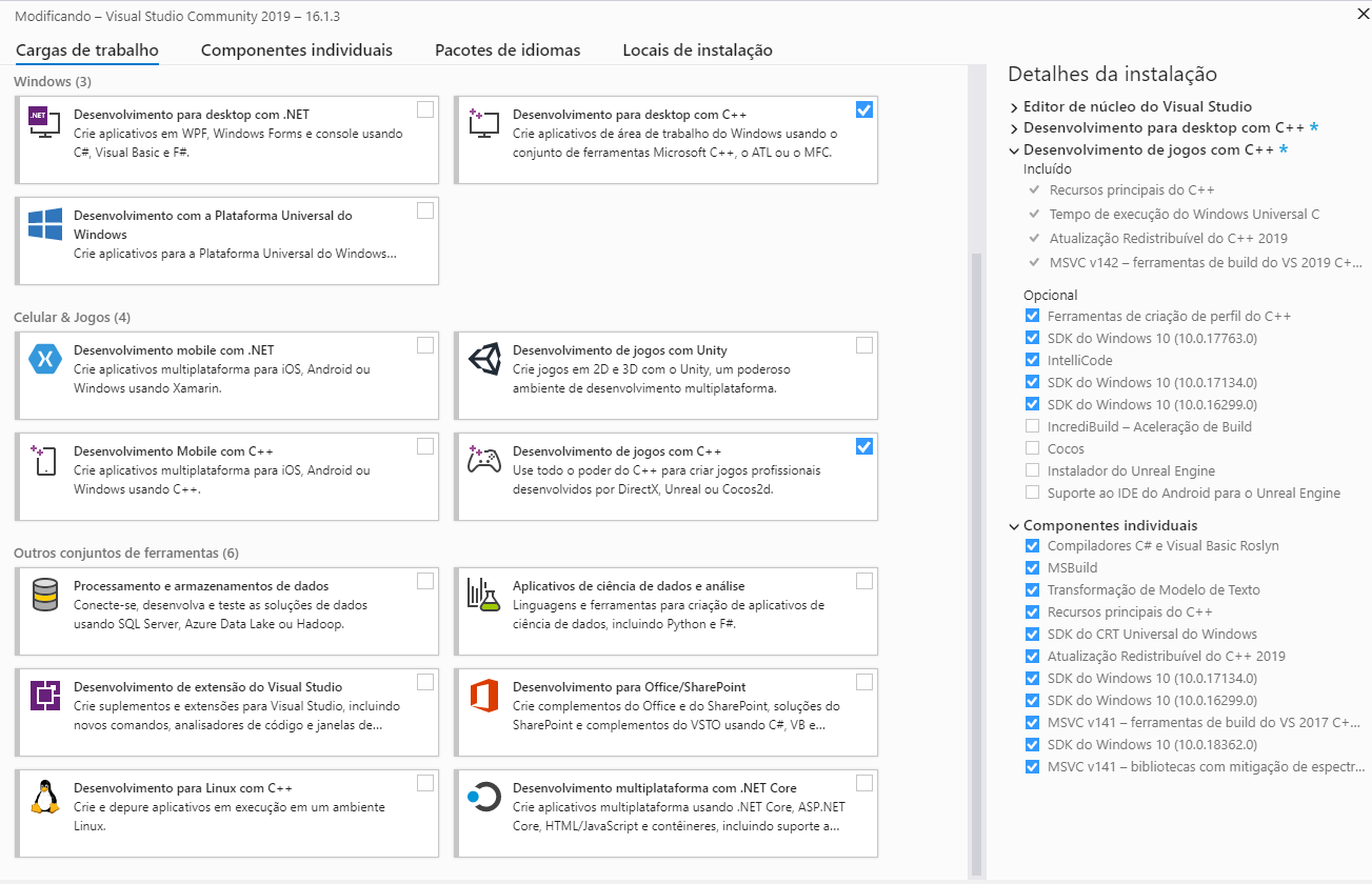 Visão geral dos componentes instalados no Visual Studio 2019: